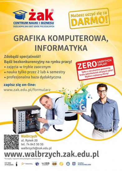 Marzysz o dodatkowych umiejętnościach graficznych? Chcesz zdobyć nową specjalizację jako informatyk? A może chciałbyś pracować w marketingu przy tworzeniu reklam? Grafika komputerowa to idealny kierunek dla Ciebie! Nowe kwalifikacje można zdobyć w jedyne 10 miesięcy! Dowiedz się więcej na www.zak.edu.pl  lub przyjdź bezpośrednio do sekretariatu szkoły: Wałbrzych, Rynek 20, Tel. 74 843 30 30.
